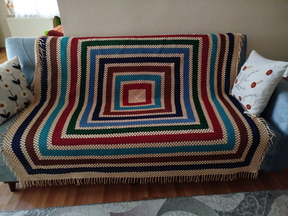 Kare desenli, çok renkli ve koyu tonlarda örgü masa örtüsü, püsküllü kenarlarıyla sıcak ve dekoratif bir dokunuş sağlar. ️