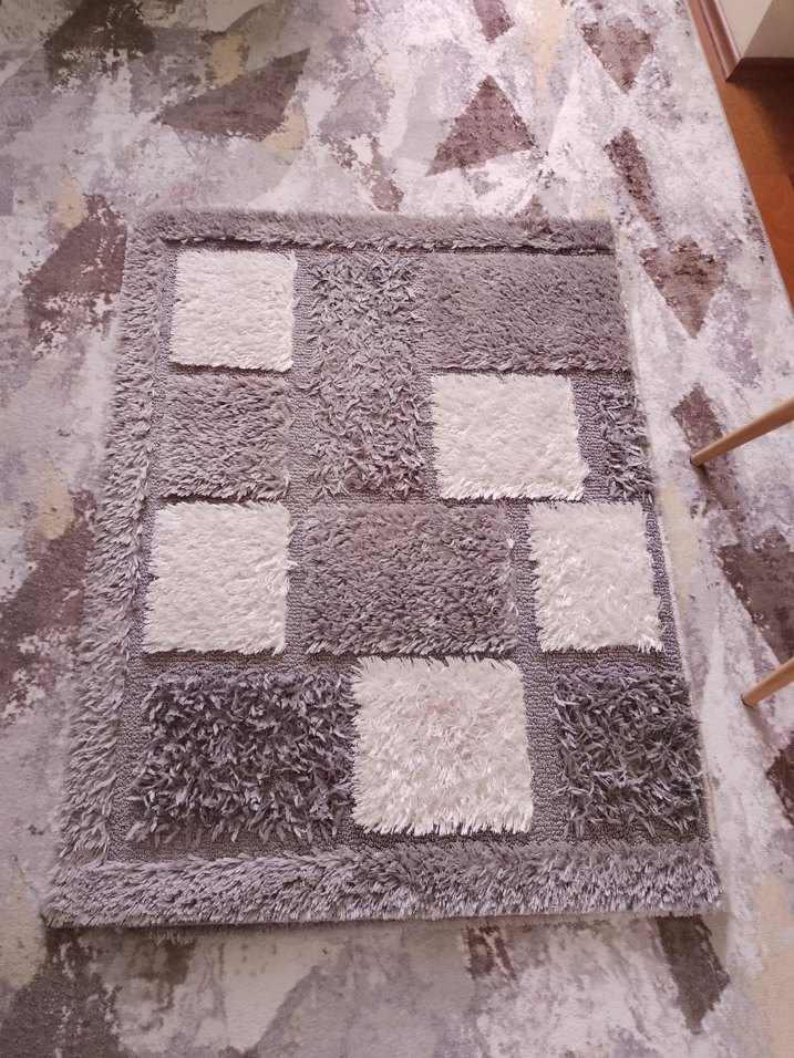 gri tonlarda kare desenli, yumuşak dokulu geleneksel tarzda halı. boy 120 en 90