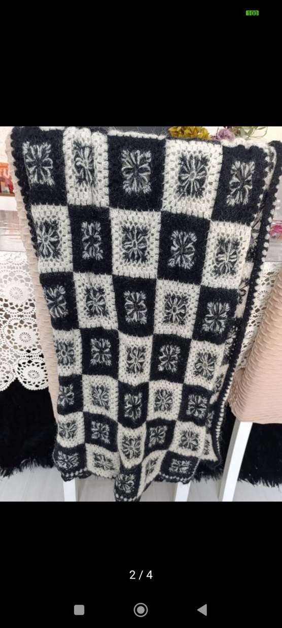 Koyu gri kare desenli el örgüsü şal , her karenin içinde çiçek motifleriyle el örgüsü görünümünde olup, sıcak tutar