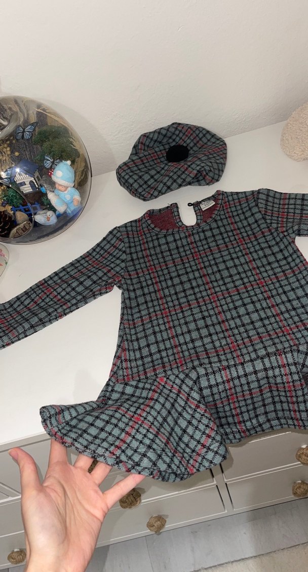 Gri kare desenli, uzun kollu ve yuvarlak yakalı bol kesim kız elbisesi. Yumuşak sentetik örme kumaştan üretilmiş olup, uyumlu bere ile birlikte gelir.