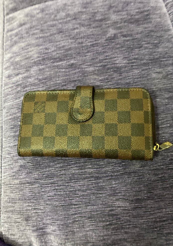 Kare desenli kahverengi kadın cüzdan, fermuarlı kapanışa sahip, modern klasik tarzda ve günlük kullanıma uygun. Orjinal değil
