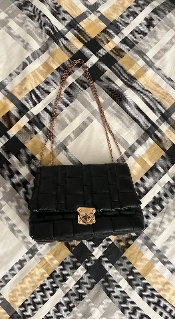 Kare desenli siyah deri kadın çantası, tokalı kapama ve zincir askıya sahip. Trendy casual sokak stili için uygun.