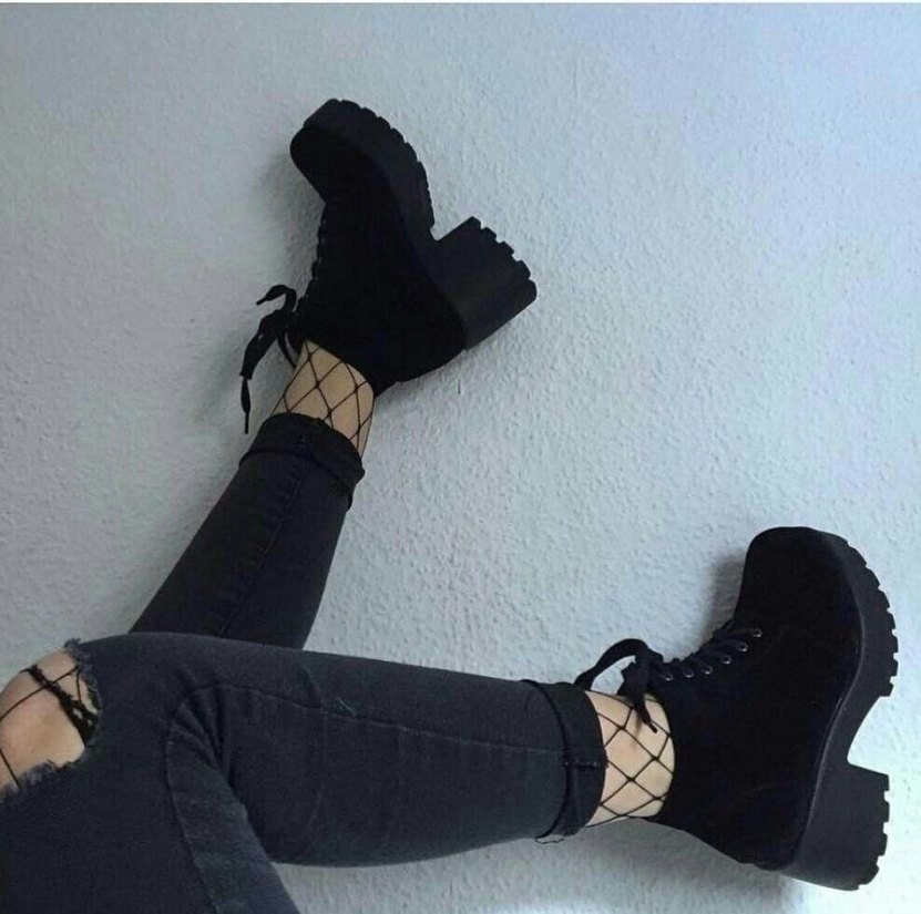 Kare desenli, tokalı siyah goth kadın botları, blok topuklu ve kot kumaştan yapılmıştır. Günlük kullanıma uygun rock punk tarzı.