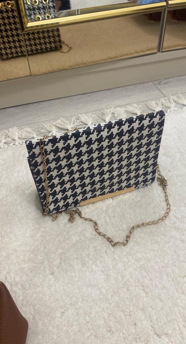 Siyah beyaz kare desenli, altın renk zincir askılı kadın çantası, dikdörtgen şekilli ve kapaklı, günlük kullanım için uygundur.