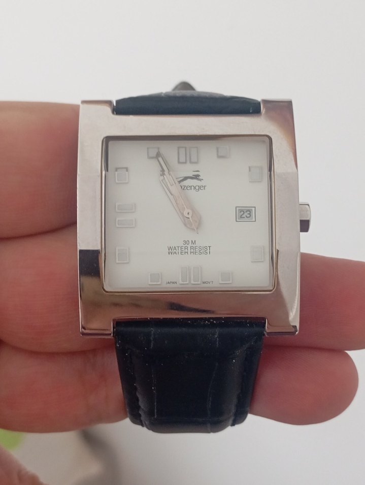 Bu erkek kol saati, kare beyaz kadran ve koyu deri kayışa sahiptir. 3 konumunda tarih göstergesi bulunur ve 30 metre su geçirmezlik özelliği vardır. Çağdaş iş stiline uygundur. ⌚