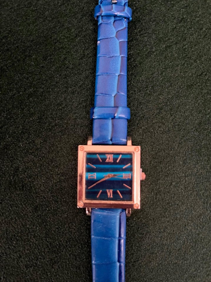 Mavi tokalı kayışı ve Roma rakamlı kare kadranı ile kadın kol saati, çağdaş ve klasik tarzı bir arada sunar. ⌚