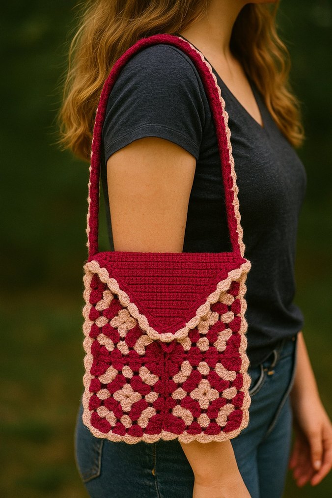 Bordo renkli, kare motif örgü çanta bohem.