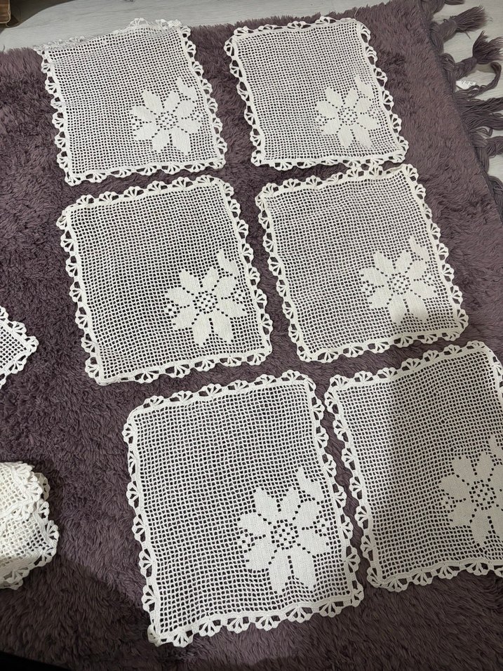 Kare şeklinde, çiçek motifli beyaz el örgüsü dantel peçeteler, zarif kenar detaylarına sahip. Sofranıza klasik bir dokunuş katar.