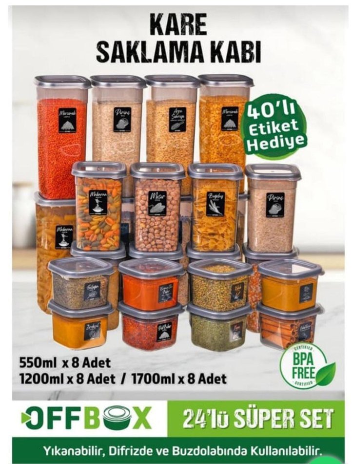 550ml, 1200ml ve 1700ml boyutlarında 24'lü kare saklama kabı seti. BPA içermez, yıkanabilir ve dondurucu ile buzdolabında kullanılabilir. 40 etiket hediye