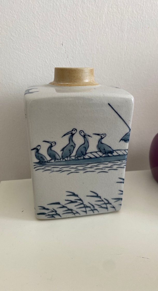 Kare seramik vazo, mavi kuş desenli ve doğal bej kenarlıklı. Pürüzsüz yüzey ve zarif sanat deseni bulunur.