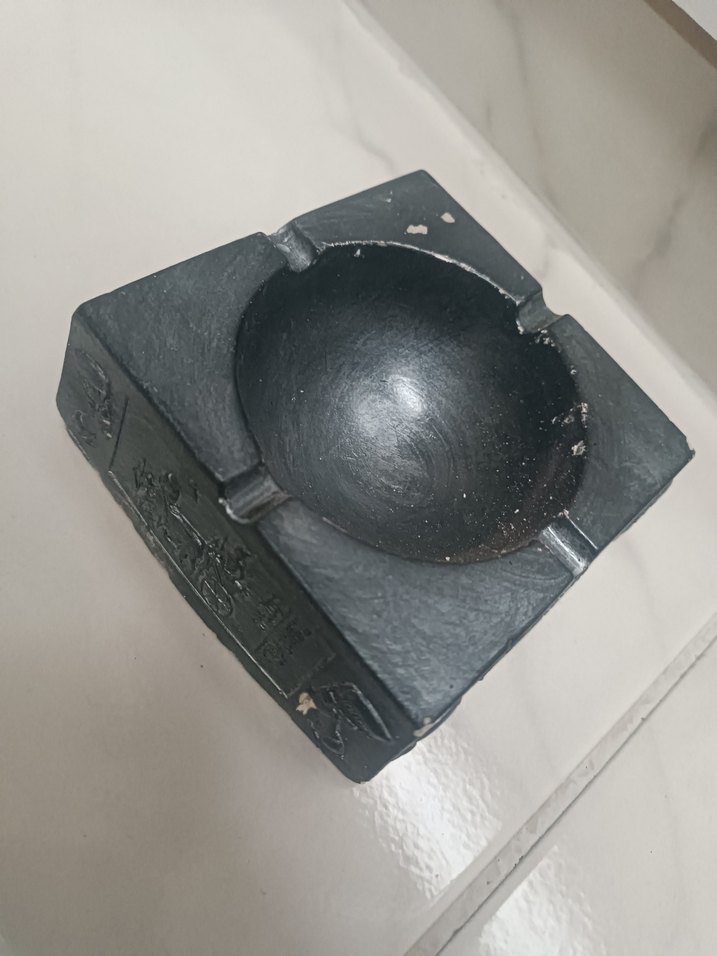 Derin merkezli, köşelerinde sigara koyma yerleri bulunan kare siyah küllük.