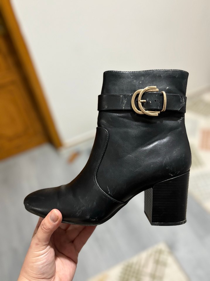 Kare topuklu siyah deri bot, şık tokalı kayış ve hafif yılan derisi dokusuna sahip. Günlük rahat kullanım için uygundur.