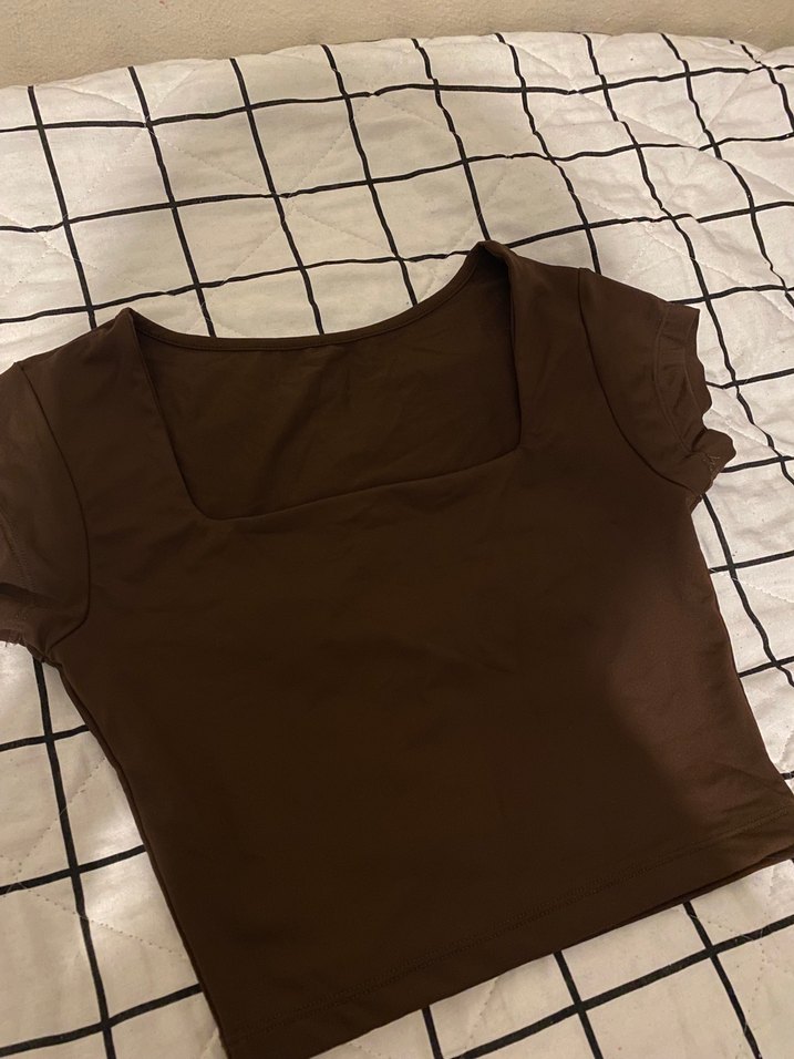 Bu kahverengi crop top, tekne yaka ve kısa kollu olup, vücuda oturan kesime sahiptir. Düz ve yumuşak sentetik kumaştan yapılmıştır, günlük sokak stiline uygundur.