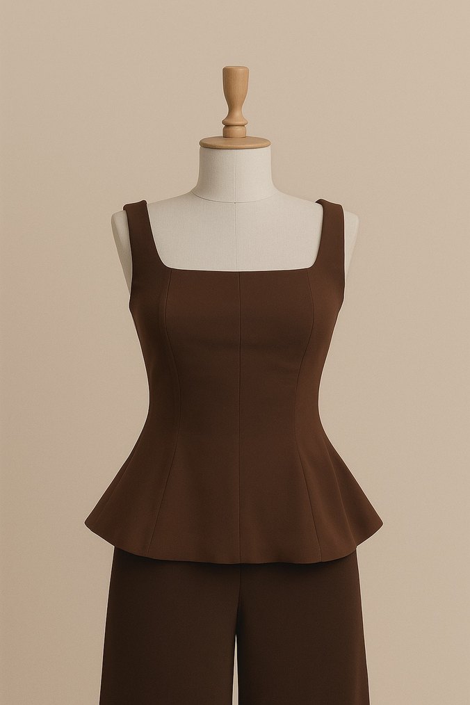 Kare yaka ve kolsuz tasarıma sahip, sentetik kumaştan üretilmiş düzenli kesim kahverengi kadın bluz. Ofis için uygun, desen içermeyen ve zarif bir şıklık sunar. ✨