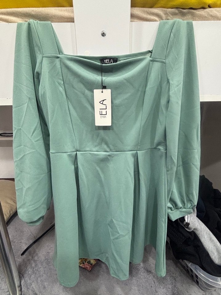 Yeşil midi elbise, uzun kollu ve kare yakalıdır. bol kesim ve yumuşak sentetik kumaştan, günlük rahat stil için uygundur.