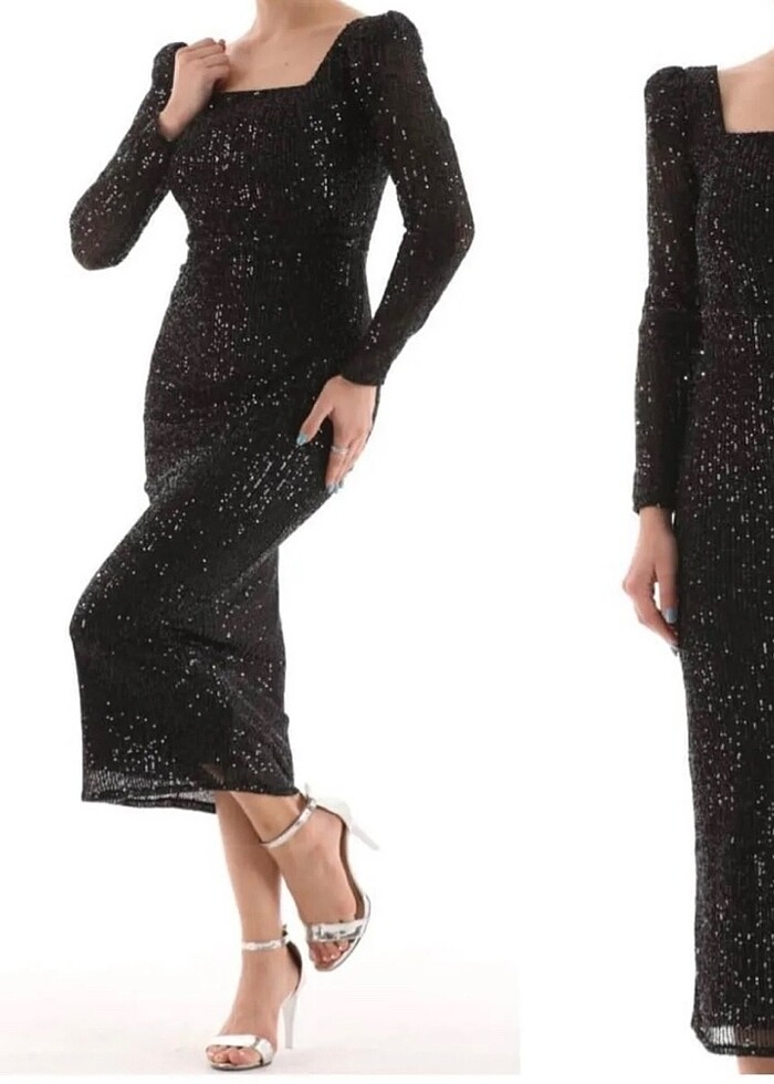 Kare Yaka Pul Payetli Abiye Elbise