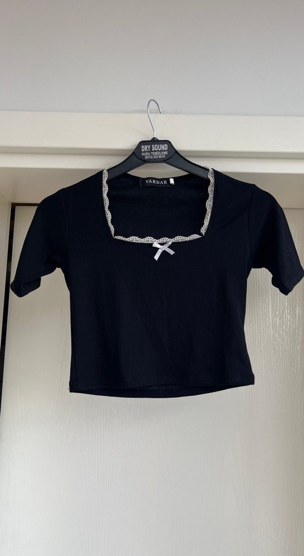 Kısa kollu, kare yaka, dantel ve küçük fiyonk detaylı siyah crop top.