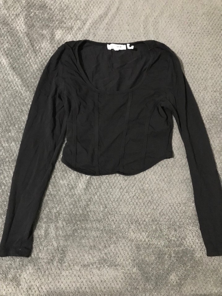 Siyah, uzun kollu ve kare yakalı, ince kesim kadın bluz. Düz ve yumuşak sentetik kumaştan, minimalist tarzda midi boyda, günlük kullanıma uygun.