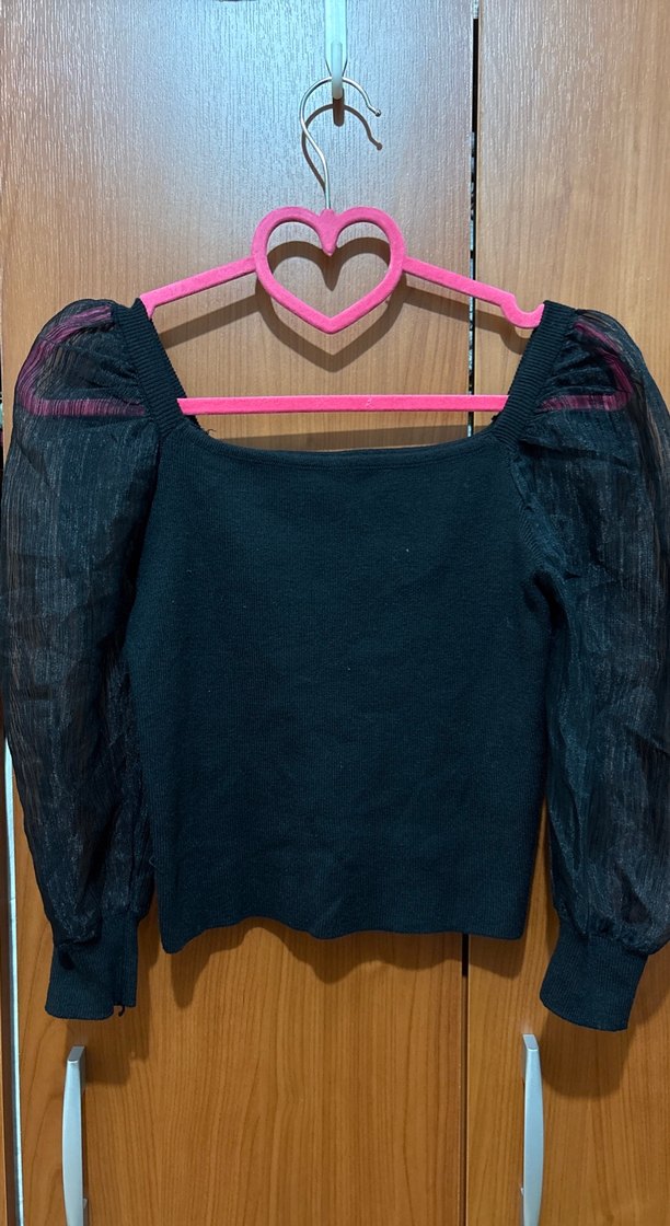 Siyah, kare yakalı ve uzun tüllü kollu, yumuşak sentetik kumaştan yapılmış dar kesim gotik tarz bluz.