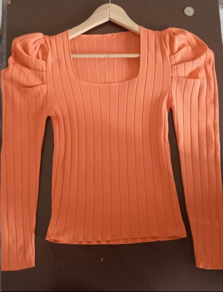 Uzun kollu, kare yaka, pastel turuncu triko bluz, günlük kullanıma uygun rahat ve modern bir tarz sunar.