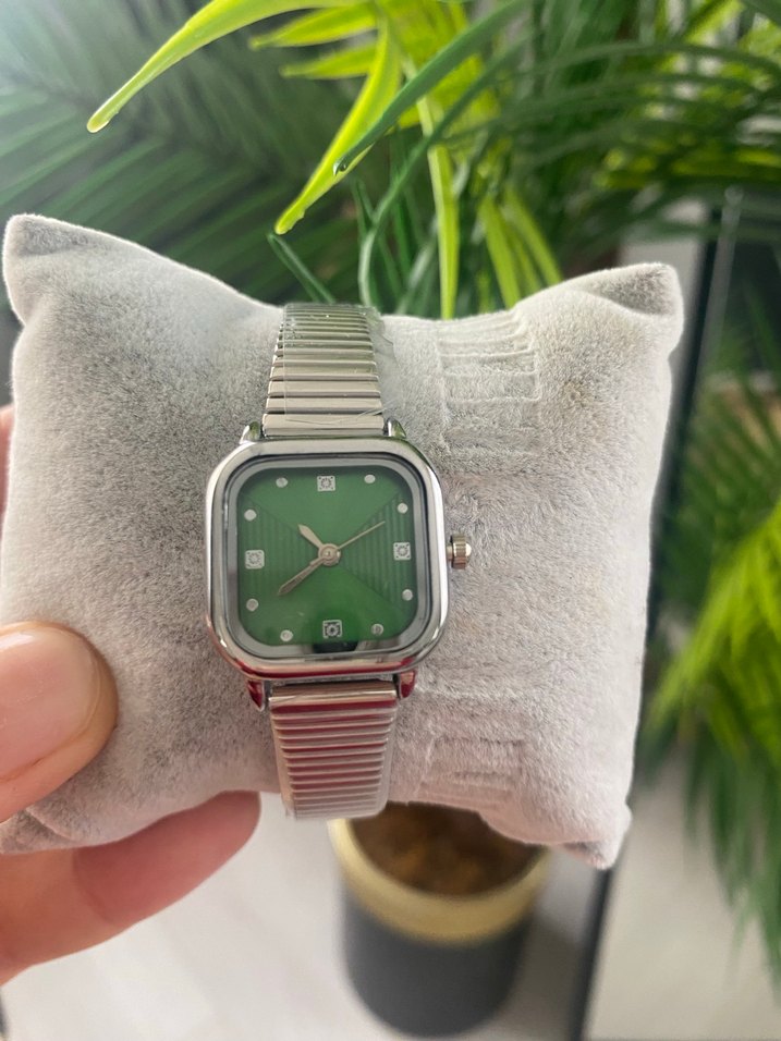 Gümüş renkli kayışa sahip kare yeşil kadranlı kadın kol saati. Canlı renklerle klasik ve eski tarz bir görünüm sunar. ⌚çelik tir