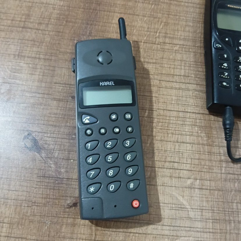 Karel markalı gri-bej renk eski telefon, sayısal tuş takımı ve küçük ekran ile birlikte antenli basit tasarıma sahiptir.