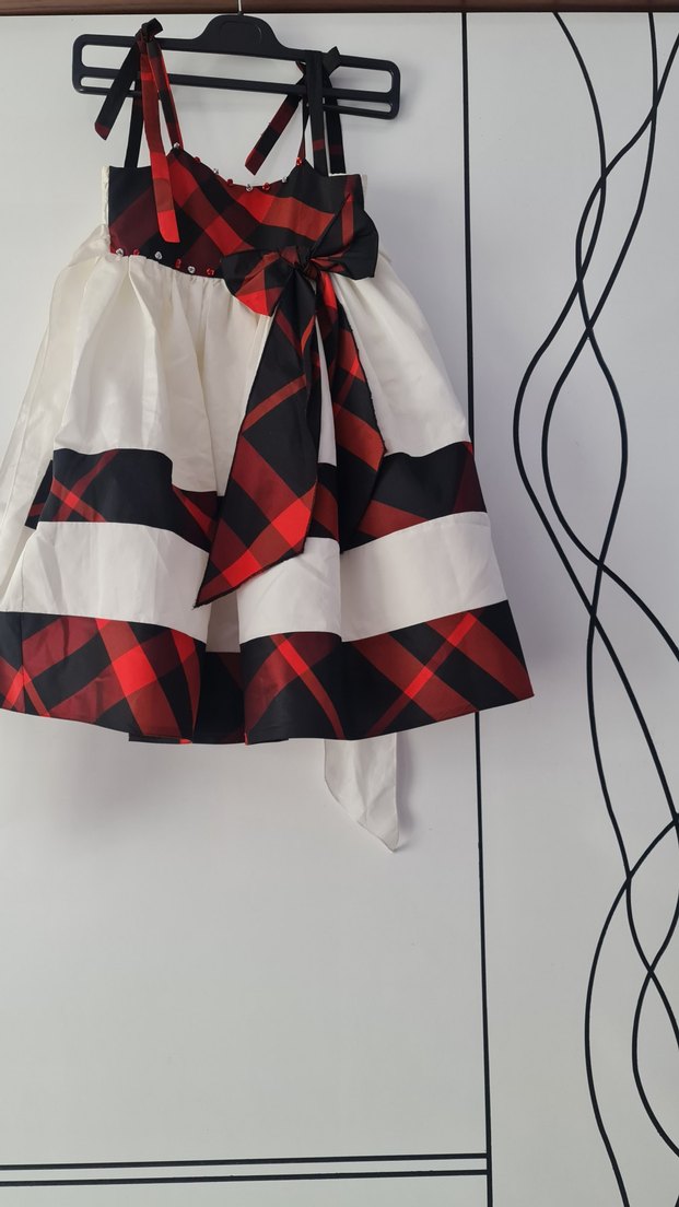 Kareli desenli, askılı ve pileli kız elbisesi. Gevşek kesimi ve yumuşak sentetik kumaşıyla modern bir görünüm sunar. arka lastik kısmında hafif esneme ve sarartı var haricinde sorunsuz