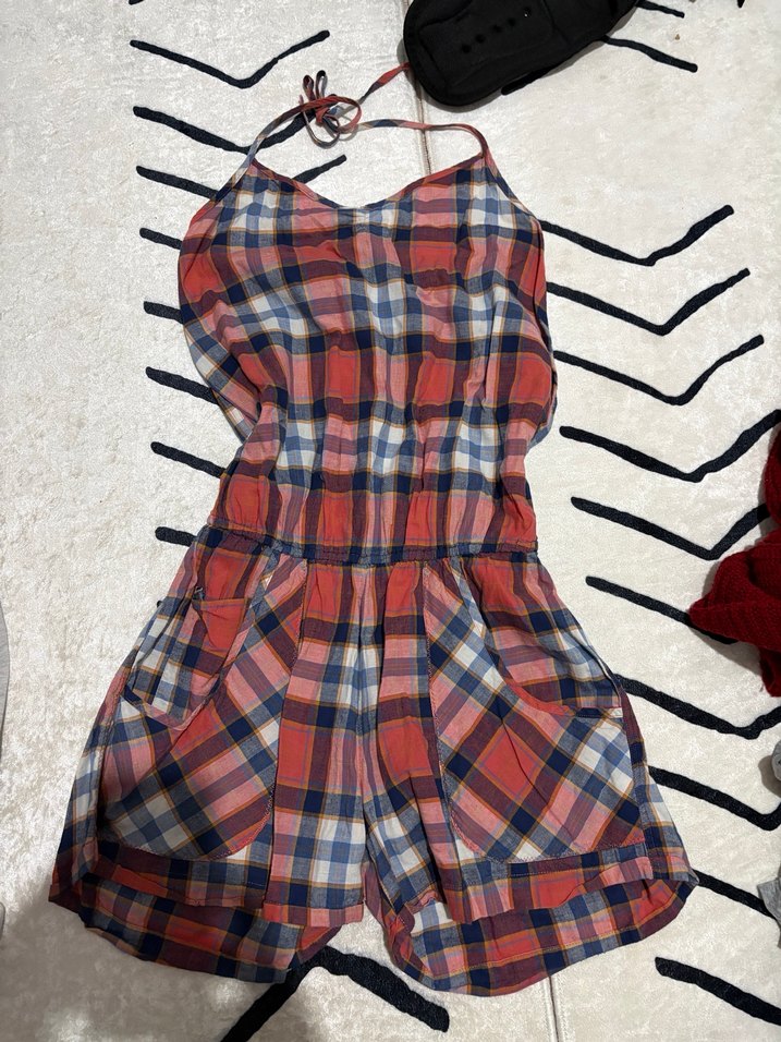 Bu dar kesim midi tulum, askılı ve çok renkli kareli desenlidir. Rahat tarzda, tokalı detaylara sahiptir, günlük kullanım için uygundur.