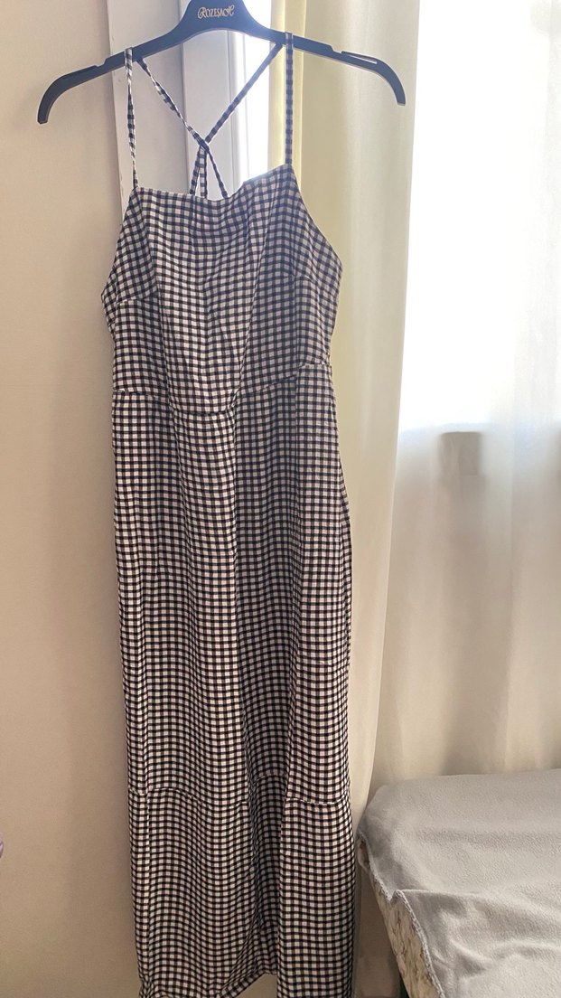 Askılı, kareli ve pile detaylı bu uzun kadın elbisesi, sentetik kumaştan üretilmiş, günlük rahat kullanım için uygun, Paris sokak modası tarzında ve koyu kahverengi tonlarda.