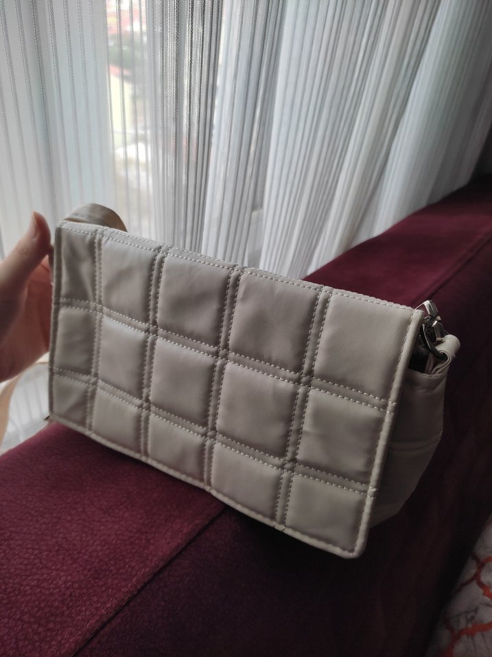 Kareli desenli, tokalı bej deri kadın omuz çantası, trend sokak stili için uygun.