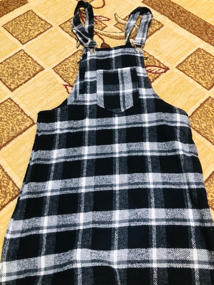 Yumuşak ve sıcak kumaştan, koyu gri kareli desenli, bol kesim kız salopet. Ayarlanabilir tokalı askıları vardır. İade yoktur