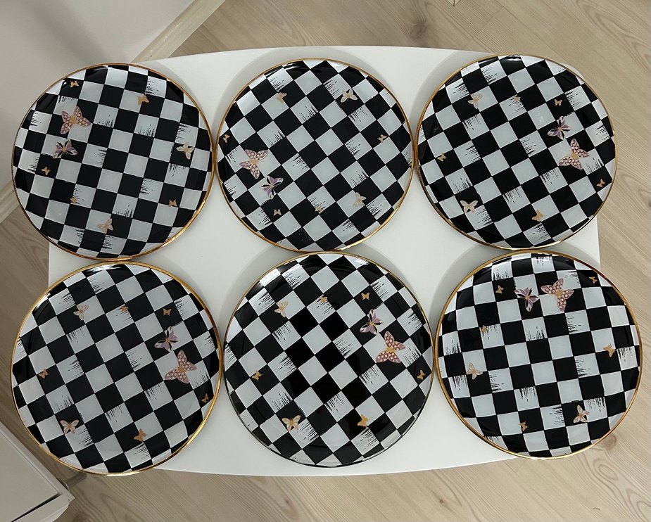 Sıfır üründür.Makineye atıldığı için tabakların kenarlarındaki gold detaylarda silinme var bazılarında.Kelebek desenli ve altın kenarlı, koyu kareli desene sahip modern klasik tabak seti.