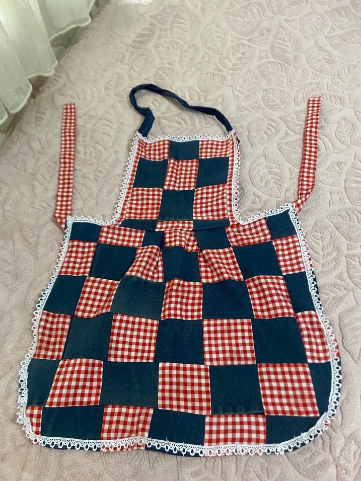 Bu mutfak önlüğü koyu mavi ve kırmızı kareli desenli, beyaz dantel detaylıdır. Boyun ve bel bağlarıyla ayarlanabilir.