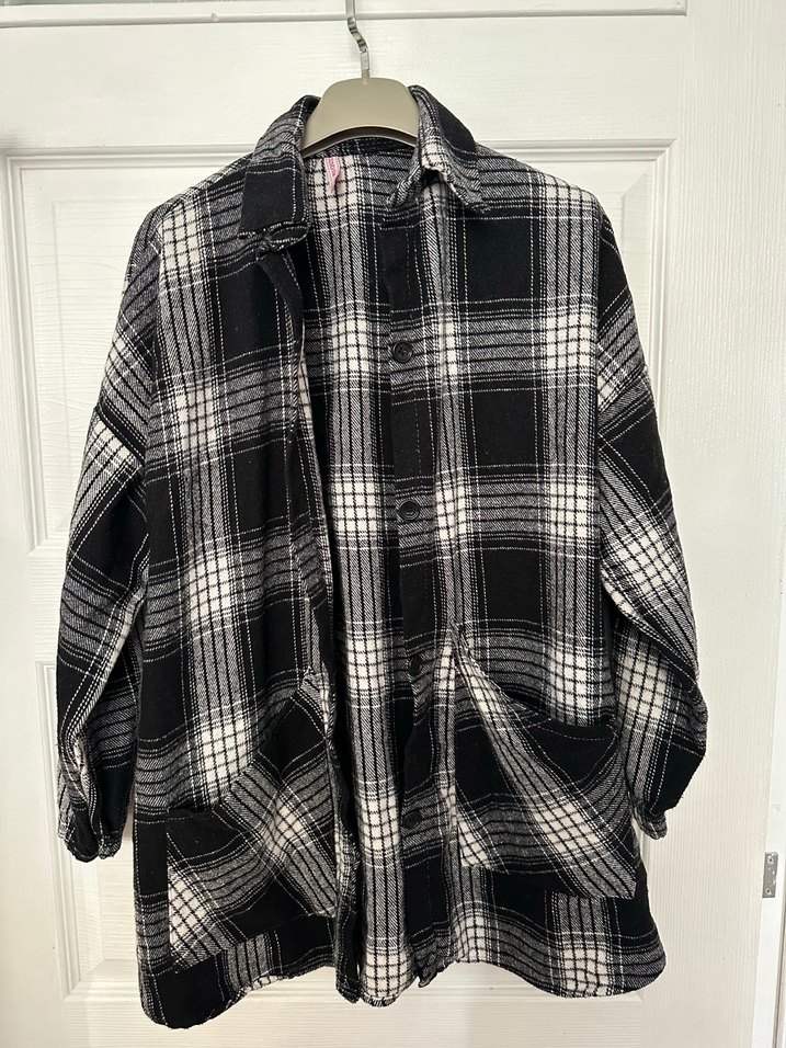kareli, düğmeli, uzun kollu, bol kesim kadın gömleği. Notlu yaka ve yumuşak, rahat kumaşla günlük sokak stili için uygun.