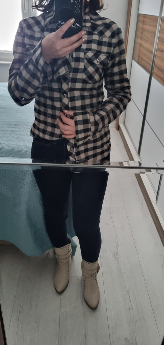Yumuşak kumaştan, kareli ve düğmeli, uzun kollu, yakası kesik detaylı, normal boyda, dar kesim kadın gömleği.