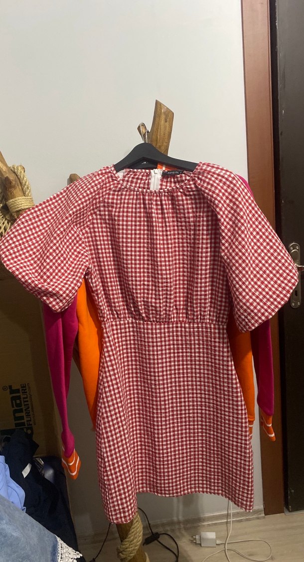 Çok tatlı temiz kareli balon kol elbise marka temsili