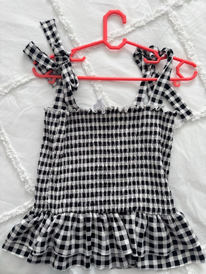 Kareli desende, ince askılı ve fırfırlı etek ucu olan, sentetik yumuşak kumaştan yapılmış dar kesim kız bluzu. Trendy ve rahat tarz için uygun. XS beden hiç kullanılmamış.