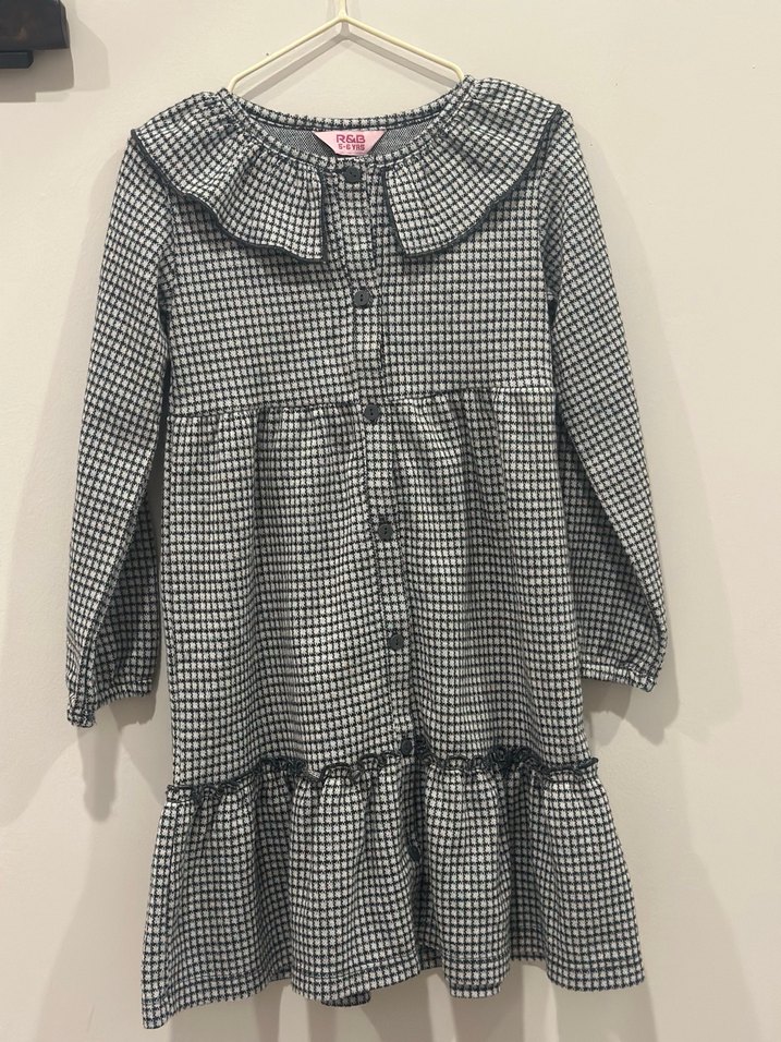 Gri kareli, yakalı ve fırfır detaylı bol kesim elbise. Uzun kollu ve yumuşak, sıcak kumaştan üretilmiştir. Günlük kullanım için uygundur.