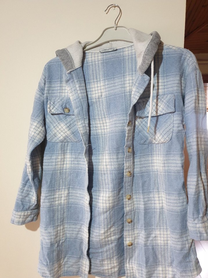 Mavi beyaz kareli uzun kollu şapkalı önü düğmeli gömlek