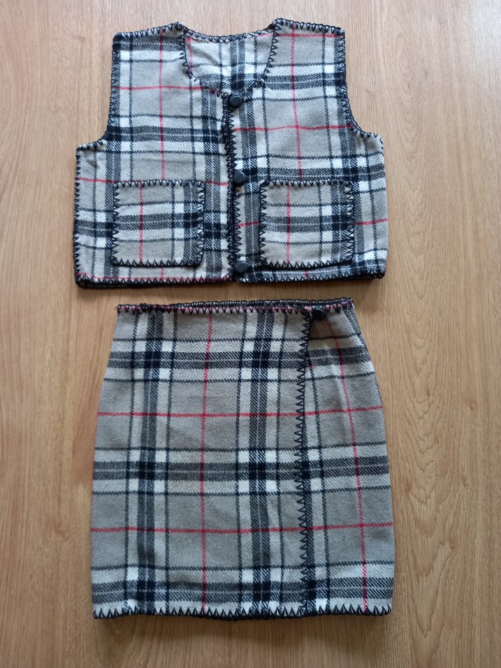 Kareli desenli gri kız çocuk yelek ve etek takımıdır. Yelekte düğmeli, yakalı ve cepli detaylar vardır. Etek ise aynı desende ve kumaştan yapılmıştır. Özel dikimdir. Beden bilmiyorum ama 7 - 8 yaşa olur diye düşünüyorum. Yine de ölçülerine göre alınız lütfen. İade kabul edilmez. Marka temsilidir.