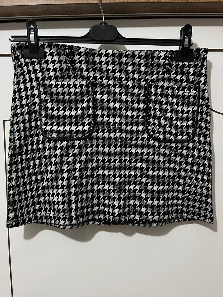 Gri kareli desenli, kemerli ve dar kesim mini etek. Sentetik kumaştan, günlük sokak stiline uygun şık bir parça.