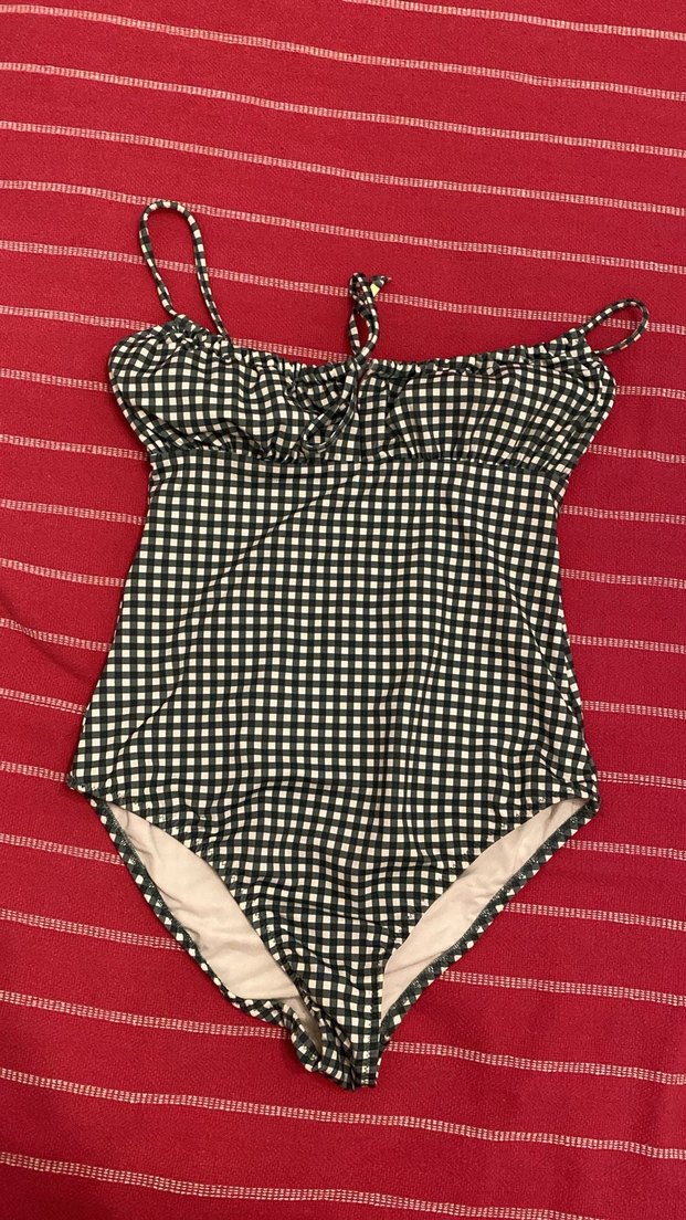 İnce askılı, yesil beyaz potikareli desenli, göğüs kısmında fırfır detaylı, vücuda oturan tek parça mayo. markasi penti yeni alindi bir kere giyildi tertemiz