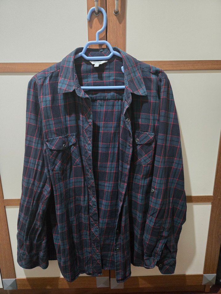 Pamuk kumaştan yapılmış, uzun kollu ve düğmeli bu kadın gömleği, rahat kesimi ve kesimli yakasıyla lacivert tonlarında ve hafif kareli desende. Ürünün defosu yoktur.