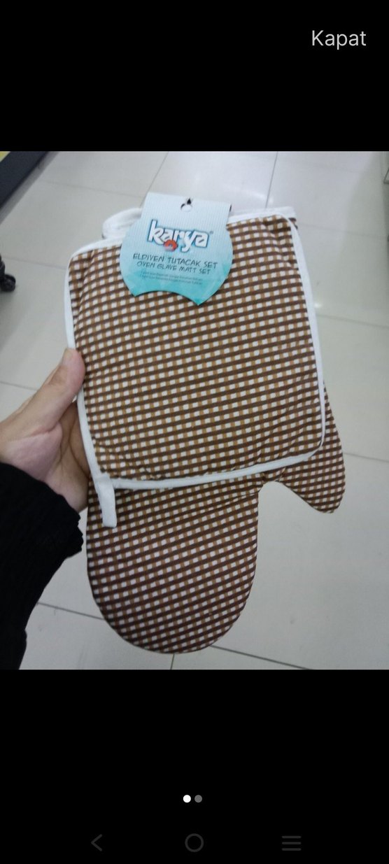 Kahverengi kareli fırın eldiveni ve uyumlu tutacak seti, yumuşak dokuludur. "Karya" markasına ait etiketlidir.