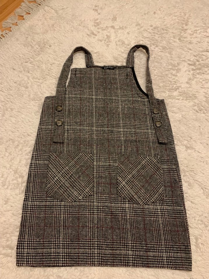 Kahverengi ve gri tonlarda kareli desenli, önünde iki cepli ve ayarlanabilir askılı salopet tulum elbise