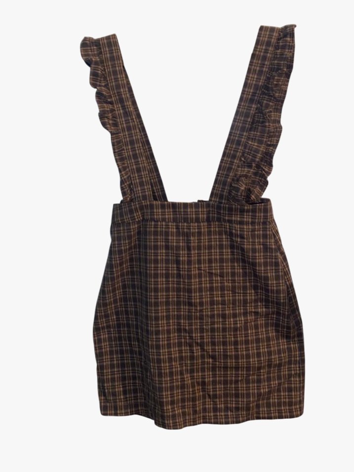 Kahverengi kareli, fırfırlı askılı, bol kesim kısa kadın salopet. Midi boy ve askısız yakasıyla Paris sokak modasına uygun.