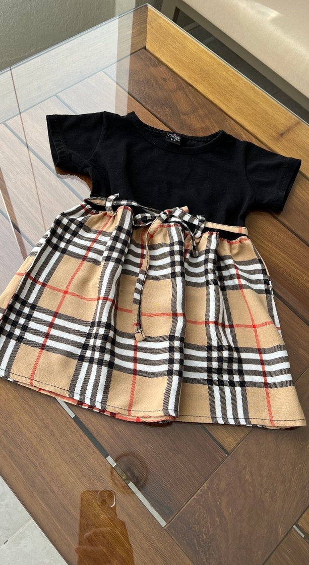 Kısa kollu, bisiklet yaka siyah üst kısmı ve koyu kahverengi kareli, kemerli bol kesim etek kısmı olan kız çocuk elbisesi.