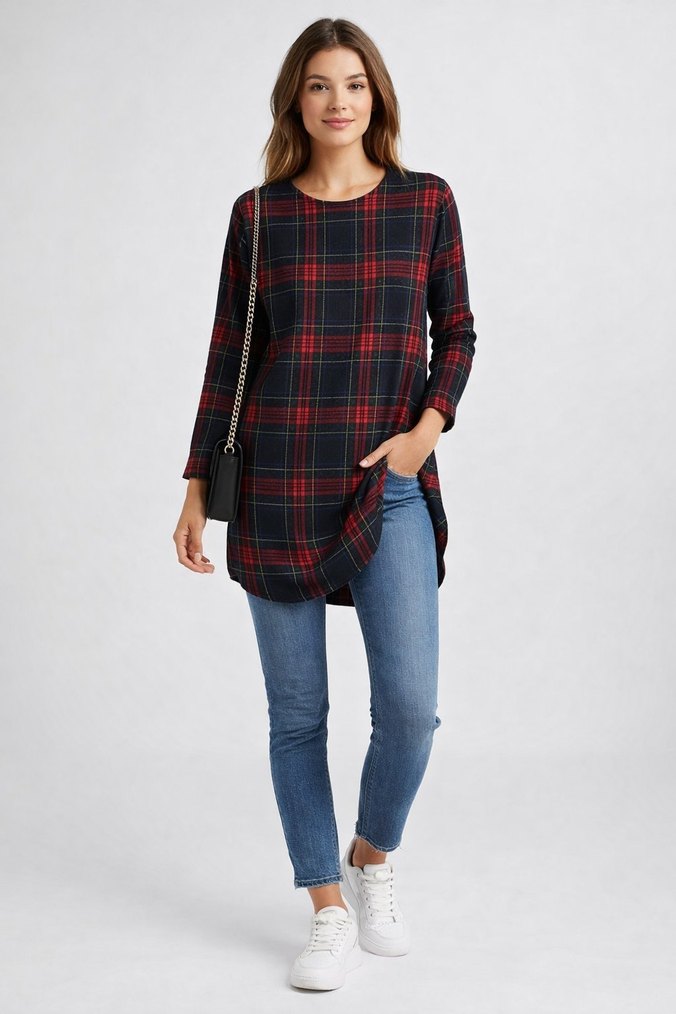 Kareli desenli, uzun kollu, yuvarlak yaka, kırmızı tonlarında denim midi uzunlukta bol kesim tunik. Rahat ve şık günlük kombinler için ideal.