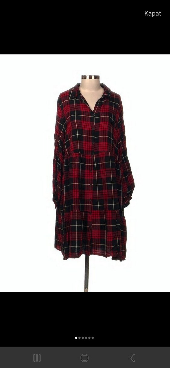 Koyu kırmızı kareli, düğmeli, yakalı ve uzun kollu, bol kesim hamile bohem tunik, yumuşak sentetik kumaştan yapılmıştır.