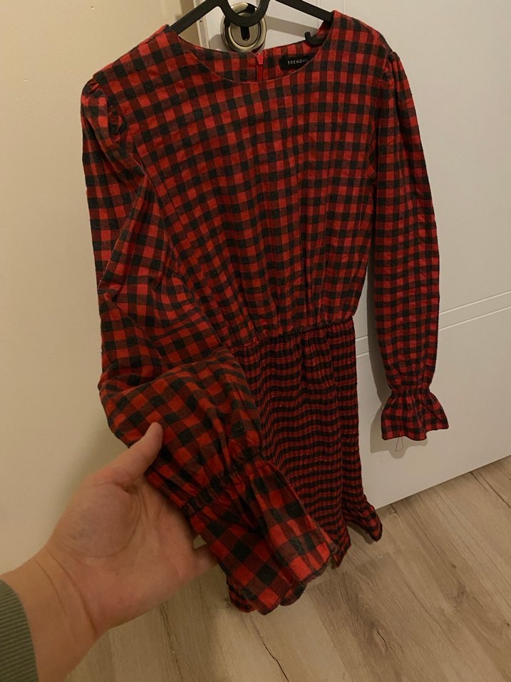 Kırmızı kareli mini elbise, uzun kolları ve pileli manşetleriyle dikkat çeker. Vücuda oturan kesimi ve yuvarlak yaka detayına sahiptir.